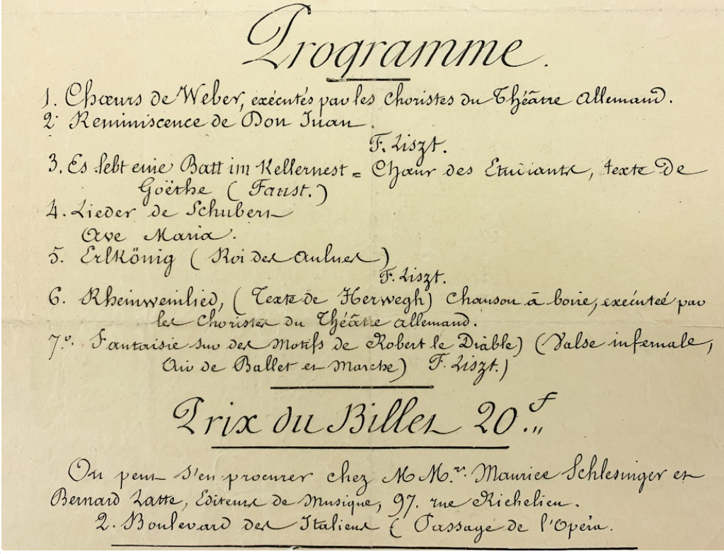 The first one I would like to share is the actual handwritten program (broadside) from the night Liszt played at Colonel Thorn’s salon. You may remember that the concert was to raise funds for an impoverished German orchestra who had fallen on hard times in Paris.