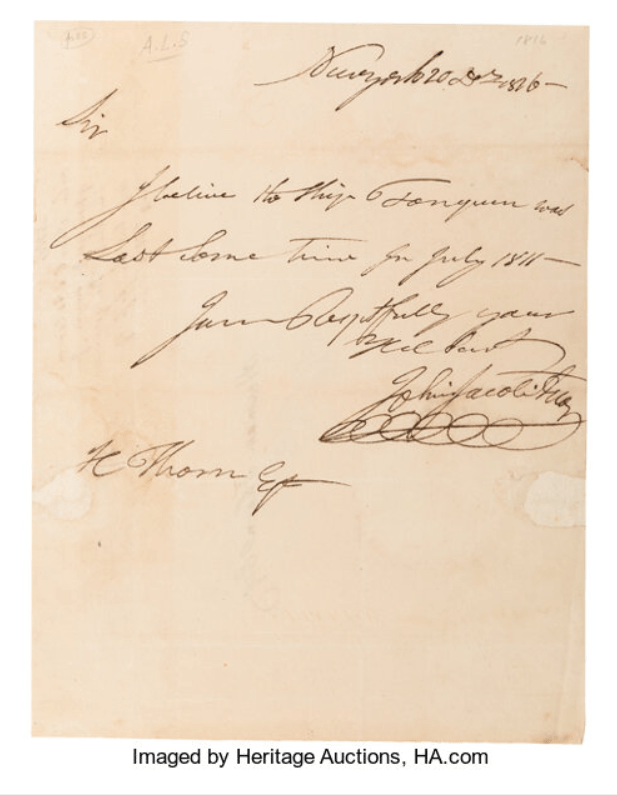 John Jacob Astor Autograph Letter Signed, “John Jacob Astor.” One page, 7.25″ x 9.5″, New York, New York; December 20, 1826. Letter from the German-American businessman, merchant, and real estate investor Astor (1763-1848) to Herman Thorn concerning Astor’s ship Tonquin. Astor writes “I believe the ship Tonquin was lost some time in July 1811.”